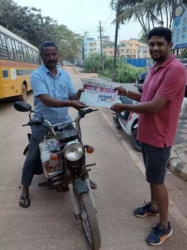 Pic: Shrinivas Banda hands over a copy of TOI to a reader; SiddappaHubballi: Shrinivas Banda, a newspaper vendor who supplies newspapers to households on hi bicycle for 33 years, and Siddappa Pammannavar, who has been working for 26 years, have become role models for other vendors. Banda supplies papers to 600 households without missing a single day.Banda has delivered newspapers to his clients during difficult times, risking his life when communal tensions between Hindus and Muslims regarding Idgah problem arose. During Covid-19, when the entire country was in lockdown, he faced many challenges in supplying newspapers. Households stopped buying newspapers during the pandemic years. Shrinivas depends solely on selling newspapers.Born in Hubballi, Shrinivas Bande completed SSLC, discontinued his education, and chose to sell newspapers. He has a son and two daughters and lives in a rented house.Shrinivas Banda told TOI, “We don’t receive any benefits from the govt. Recently, we have been included in the Karnataka State Unorganised Workers’ Social Security Board (KSUWSSB). Supplying newspapers during rainy season and on hard days is very challenging.”Undeterred by hurdlesSiddappa Pammannavar has been involved in supplying newspapers since 1999. A resident of Bairidevarkoppa, Hubballi, Siddappa pedals to Koppikar Road to collect the newspaper bundles. His brother, Shivanand, joins him in supplying newspapers. Many vendors lost their income during Covid-19. He started to supply milk to households, but later, following demand from residents, he started supplying newspapers. “I started an agency in 2004 to supply newspapers. We are not dependent on others to supply the papers,” said Siddappa to TOI.He says, “My brother and I supply around 1,200 newspapers individually. Earlier, we used to get a low margin, but now we are earning well. Daily, we start working around 3am to supply newspapers. Later in the day, we are engaged in collection of bills. We are committed to our work and have never missed supplying newspapers. The govt is not providing us any benefits. Therefore, we demand benefits for vendors for our upliftment.