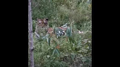 Mysuru: The sighting of a tiger at India’s only Rare Material Project (RMP) has kept foresters on their toes in Mysuru. Foresters have alerted villagers in the surrounding area on the outskirts of west Mysuru.Three teams have been formed to monitor its movement and inform villagers. Staff at the RMP, which is attached to the department of atomic energy, saw the big cat on Monday. The tiger was seen majestically sitting amid the lush green and sprawling campus of the RMP, which abuts the Arabithittu Wildlife Sanctuary spread over 5 square miles.The big cat’s presence in the 500-acre project area was recorded on a mobile phone, and the footage has gone viral. About 150 acres of the campus resemble a forest area. Project Tiger Director P Ramesh Kumar informed TOI that some tigers are outside the forest area. Two tigers died, including one in a road accident. Another tiger was found dead after it was relocated. Currently, there are about seven tigers outside the Bandipur and Nagarahole Tiger Reserves and Wildlife Sanctuary, and this could be one of them.These tigers may be feeding on small animals, including rabbits, and there hasn’t been any attack on cattle or humans. These big cats may be searching for forest pockets and may either travel to the Arabithittu Wildlife Sanctuary, he stated.The director said there are no plans to relocate these big cats unless they come into conflict with humans.Deputy conservator of forests (Mysuru) K Paramesh explained that personnel attached to Leopard Task Forces and officers of the Hunsur wildlife area are keeping a close watch on the movement of the big cat to ensure the safety of the nearby dwellers, who have been informed about the presence of the big cat. The personnel will monitor the situation for a few days.Forest officials who held a meeting with the security officers and CISF personnel on Tuesday advised them to provide a vehicle facility to staffers working in shifts and park vehicles at another location. They have also advised to clear wild vegetation as early as possible and forest officials will be visiting the campus to ascertain the situation for the next few days.