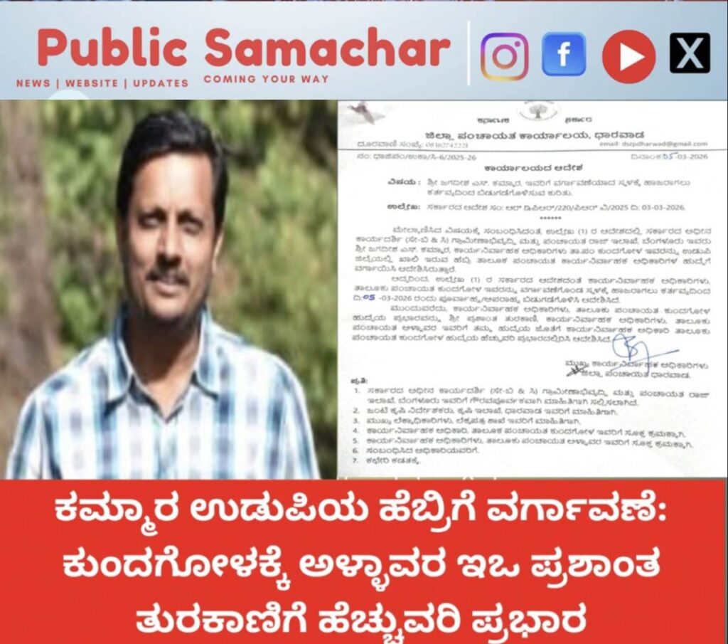 ಗ್ರಾಮೀಣಾಭಿವೃದ್ಧಿ ಮತ್ತು ಪಂಚಾಯತ್ ರಾಜ್ ಇಲಾಖೆಯ ಸರ್ಕಾರದ ಅಧೀನ ಕಾರ್ಯದರ್ಶಿಗಳ ಆದೇಶದನ್ವಯ, ಕುಂದಗೋಳ ತಾಲ್ಲೂಕು ಪಂಚಾಯತ್ ಕಾರ್ಯನಿರ್ವಾಹಕ ಅಧಿಕಾರಿಯಾಗಿದ್ದ ಶ್ರೀ ಜಗದೀಶ ಎಸ್. ಕಮ್ಮಾರ ಅವರನ್ನು ಉಡುಪಿ ಜಿಲ್ಲೆಯ ಹೆಬ್ರಿ ತಾಲ್ಲೂಕು ಪಂಚಾಯತ್ನ ತೆರವಾಗಿರುವ ಕಾರ್ಯನಿರ್ವಾಹಕ ಅಧಿಕಾರಿ ಹುದ್ದೆಗೆ ನಿಯೋಜಿಸಲಾಗಿದೆ. ಈ ಹಿನ್ನೆಲೆಯಲ್ಲಿ ಜಗದೀಶ ಕಮ್ಮಾರ ಅವರನ್ನು ಮಾರ್ಚ್ 25ರಂದು ಅಧಿಕೃತವಾಗಿ ಕರ್ತವ್ಯದಿಂದ ಬಿಡುಗಡೆಗೊಳಿಸಲಾಗಿದ್ದು, ಅವರು ಕೂಡಲೇ ನಿಯೋಜಿತ ಸ್ಥಳದಲ್ಲಿ ಅಧಿಕಾರ ವಹಿಸಿಕೊಳ್ಳುವಂತೆ ಸೂಚನೆ ನೀಡಲಾಗಿದೆ.