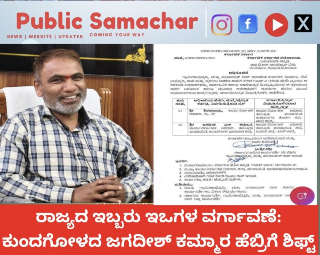 ಬೆಂಗಳೂರು: ರಾಜ್ಯ ಸರ್ಕಾರದ ಗ್ರಾಮೀಣಾಭಿವೃದ್ಧಿ ಮತ್ತು ಪಂಚಾಯತ್ ರಾಜ್ ಇಲಾಖೆಯು ಸಾರ್ವಜನಿಕ ಹಾಗೂ ಆಡಳಿತಾತ್ಮಕ ಹಿತದೃಷ್ಟಿಯಿಂದ ಗ್ರೂಪ್-ಎ (ಕಿರಿಯ ಶ್ರೇಣಿ) ವೃಂದದ ಇಬ್ಬರು ಕಾರ್ಯನಿರ್ವಾಹಕ ಅಧಿಕಾರಿಗಳನ್ನು (ಇಒ) ತಕ್ಷಣದಿಂದ ಜಾರಿಗೆ ಬರುವಂತೆ ವರ್ಗಾವಣೆ ಮಾಡಿ ಆದೇಶ ಹೊರಡಿಸಿದೆ. ಮಂಗಳವಾರ ಈ ಕುರಿತು ಸರ್ಕಾರದ ಅಧೀನ ಕಾರ್ಯದರ್ಶಿ ಎ. ಶ್ರೀನಿಧಿ ಅವರು ಅಧಿಕೃತ ಅಧಿಸೂಚನೆ ಹೊರಡಿಸಿದ್ದಾರೆ.