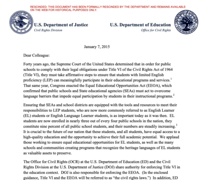 For nearly 50 years, federal law has held that failing to provide resources for students who are not proficient in English constitutes discrimination based on national origin under Title VI of the Civil Rights Act. In 1974, the Supreme Court case Lau v. Nichols affirmed that schools must take steps to ensure non-English-speaking students can meaningfully participate in education. The 1974 Equal Educational Opportunities Act and the 1981 Castañeda v. Pickard case further clarified how schools must provide services to English learners.In 2015, the Justice and Education Departments issued a 40-page guidance document detailing how schools could comply with these laws. Montserrat Garibay, who led the Office of English Language Acquisition under the Biden administration, called it “kind of like the Bible” for teachers, according to The Washington Post, “If, in fact, we want our students to learn English, this needs to be in place.”But now, the guidance has been labeled “rescinded” and remains online only “for historical purposes,” according to the Education Department. Spokeswoman Madi Biedermann said that the guidance was rescinded because it “is not in line with Administration policy”, according to The Washington Post.