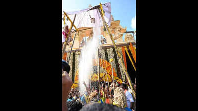 Udupi: Thousands of devotees thronged Car Street to celebrate Vitla Pindi, also known as Krishna Leelotsava or Mosaru Kudike Utsava, as part of Shri Krishna Janmashtami celebrations on Monday.The grand celebration was led by Paryaya Puttige Mutt seer Sri Sugunendra Tirtha Swami, accompanied by his junior seer Sri Sushreendra Tirtha Swami. From early morning, long queues of devotees formed at Sri Krishna Temple for darshan.As per tradition, the earthen idol of Lord Krishna was placed in the golden chariot in the afternoon, and pulled around Car Street by thousands of devotees. The seers also initiated the annadana programme at the mutt complex, where devotees were served prasadam following Palla Puja ritual.Devotees witnessed performers who, dressed as gopalakas, scaled wooden scaffolds along the procession route, and smashed mosaru kudike (curd pots), while troupes performed traditional huli vesha (tiger dance). Seers distributed laddus and chakkulis as prasadam to the gathering.After completing the Car Street circuit, the chariot returned to the temple, where Sri Sugunendra Tirtha Swami performed the ritual immersion of the clay idol in Madhwa Sarovara. The mutt complex was adorned with flowers and lights, providing an opportunity for devotees to take selfies and family photographs. Tight security arrangements were in place under the supervision of Udupi SP Hariram Shankar.Artist Ravi Katapady, celebrated for his striking fantasy characters, could not perform this year due to ill-health. “I feel terribly bad that I could not take part,” he said. Katapady has been performing for the past 14 years. For the last 10 years, he dedicated funds raised from his acts to support children in need. Hoping for speedy recovery, he said: “I wish to return next year with even more interesting characters.”