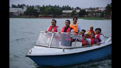 Pic: Union Minister Pralhad Joshi enjoys a boat ride with MLA Mahesh Tenginakai, HDMC mayor Jyothi Patil, and deputy mayor Santosh Chavan, after opening the water sports activities at Unkal lakeHubballi: Union minister Pralhad Joshi inaugurated the water sports and adventure activities at Unkal Lake on Sunday. Joshi, MLA Mahesh Tenginakai, HDMC mayor Jyothi Patil, and deputy mayor Santosh Chavan went for a boat ride and enjoyed themselves. Motorboats, pedal boats, jet skis, speed boats, and kayaking have been started.Speaking to the reporters, Joshi said that under the Smart City Project, Unkal lake was developed. “There was a lot of demand to start water sports and hence it has been started, and the public should take advantage of this. The Hubballi-Dharwad Municipal Corporation (HDMC) should maintain the lake in good condition,” he said.MLA Mahesh Tenginakai said that they are planning to install a zipway water ride. One additional boat will be added to operate at night. He mentioned that Hubballi should become a tourism hub, and they are working on it. A ropeway from Nrupatunga Betta to the base has been planned, and a survey has been conducted. Step by step, more activities will be added to the lake, he assured.Tenginakai said that a park will be developed under CSR or any other available funds. It is an old lake and should have a model park. Steps will be taken to develop the park, and basic amenities will be provided, he assured.HDMC commissioner Rudresh Gali and others were present.