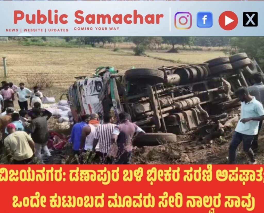 ವಿಜಯನಗರ: ಜಿಲ್ಲೆಯ ಡಣಾಪುರ ಬಳಿಯ ರಾಷ್ಟ್ರೀಯ ಹೆದ್ದಾರಿ 50ರಲ್ಲಿ ಸಂಭವಿಸಿದ ಭೀಕರ ಸರಣಿ ಅಪಘಾತದಲ್ಲಿ ಒಂದೇ ಕುಟುಂಬದ ಮೂವರು ಸೇರಿದಂತೆ ಒಟ್ಟು ನಾಲ್ವರು ಸ್ಥಳದಲ್ಲೇ ಮೃತಪಟ್ಟಿದ್ದಾರೆ. ಘಟನೆಯಲ್ಲಿ ಸುಮಾರು 25ಕ್ಕೂ ಹೆಚ್ಚು ಜನರಿಗೆ ಸಣ್ಣಪುಟ್ಟ ಗಾಯಗಳಾಗಿದ್ದು, ಅವರನ್ನು ಸಮೀಪದ ಆಸ್ಪತ್ರೆಗೆ ದಾಖಲಿಸಲಾಗಿದೆ.