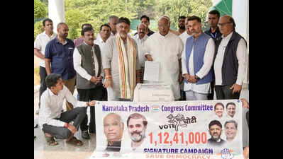 Bengaluru: The Karnataka unit of Congress Monday handed over more than 1.1 crore signatures collected from across the state besides supporting documents on the party’s allegations of large-scale vote theft in the country to national party president Mallikarjun Kharge. After submitting the signatures packed in ballot boxes — symbolising votes being cast — in New Delhi, KPCC president and deputy CM DK Shivakumar said Karnataka was the first to expose the vote theft issue, using Bangalore Central Lok Sabha seat as a case study. “An AICC team and Mansoor Ali Khan, our candidate who was defeated, investigated it and found out how votes were stolen,” Shivakumar said. “Together with Rahul Gandhi, we wanted to lead this fight from the front. As a result, today we have submitted boxes containing 1.1 crore signatures collected from people across Karnataka against vote theft,” said Shivakumar, adding that the first box was handed to Kharge. Accusing the Election Commission of India (ECI) of acting under pressure from the BJP-led central govt, Shivakumar said, “It is the duty of the ECI to ensure that the vote of every citizen in this country is protected. It cannot shy away from this.” He claimed Election Commission’s ongoing special intensive revision (SIR) was an admission that something was wrong with voter lists. “If there are no doubts about voter lists, why is ECI holding SIR?” Shivakumar asked. “The EC has not done justice to Bihar voters,” he alleged, saying the votes of the poor and migrants were deleted on a large scale. “One man, one vote should be ensured and irregularities should be removed,” Shivakumar said. Asked on his alleged ongoing tussle with Siddaramaiah over the chief minister’s post, he said: “I am not here to speak on politics. I am here to save democracy and save votes.”