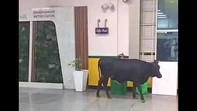 Bengaluru: Commuters at Banashankari Metro station got an ‘udderly’ unexpected surprise Wednesday when a cow calmly wandered into the station as if it had a ticket to travel.The uninvited visitor was spotted near the sugarcane juice stall and the staircase area, probably wondering whether the escalator led to greener pastures. A video clip of the incident, now doing the rounds on social media, has left Bengalureans amused and alarmed. Banashankari, one of the city’s busiest Metro stations, sits beside a bustling vegetable market that comes alive at dawn. Poor waste management around the market has turned the area into a magnet for stray cattle. Vendors routinely dump fruit and vegetable waste on road medians and near Metro premises, attracting cows in search of food. This poses risks to motorists and pedestrians, with frequent stray sightings between JP Nagar Metro station and Banashankari Circle. But this, perhaps, was the first time a cow strayed into a Metro station.A BMRCL official said: “It (the cow) was nibbling on banana stems near the entrance. Our staff moved it out in under a minute.” The cow’s sighting has reignited concern over the rising number of stray cattle along Kanakapura Road. Chandrashekar R, a Banashankari resident, said, “I live near Pipeline Road and travel daily from Banashankari to BTM Layout. Accessing the TTMC has become a major hassle, as vendors occupy the footpath and litter after their business. The authorities must ensure scientific waste disposal, as vegetable waste dumped on road medians attracts cattle. This has caused major inconvenience to people using the road every day.”Flower merchant GM Diwakar said, “After the pandemic, there was a sharp drop in farmers selling produce, especially flowers, at KR Market. Now, farmers with small land holdings prefer markets like Banashankari, Yelahanka, Madiwala, and others. The closure of the KR Market parking lot has become another major issue preventing farmers and traders from going there. They arrive early morning and finish sales by 8.30am or 9am. When they don’t get a fair price, they dump unsold produce and leave. Since agricultural goods are perishable, not getting the right price causes financial stress. That’s why waste is dumped on medians and nearby roads. Everyone knows how the waste collection mafia operates, and only the authorities can address the issue.”Even Bengaluru South corporation commissioner KN Ramesh’s clean-up drives haven’t been able to keep the area free of cows. “We’ve cleared garbage repeatedly, but it keeps coming back,” said an official.